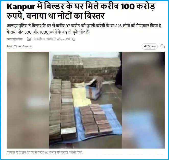 A reverse image search with the keyframes of the video led us to a video report uploaded to NDTV’s YouTube account on 17 January, 2018 , containing scenes related to the viral video. The report stated that approximately ₹97 crore worth of demonetised ₹500 and ₹1,000 notes were recovered from a house in Kanpur. These notes were found piled up in a bed.