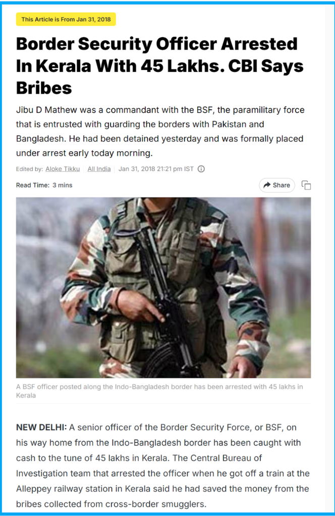 Next, we conducted keyword search for the claim made about BSF Commandant Mathew. In this context, we found a report published on the NDTV website on 31 January, 2018. The report states, “A senior officer of the Border Security Force (BSF), Jibu D Mathew, was arrested by the Central Bureau of Investigation (CBI) in Kerala for carrying 45 lakhs in cash, allegedly obtained from bribes from cross-border smugglers. Mathew, a commandant tasked with guarding the India-Bangladesh border, was detained after disembarking from a train at Alleppey railway station. The CBI discovered 18 bundles of Rs 2,000 notes totalling 34.4 lakhs and 22 bundles of Rs 500 notes amounting to 10.8 lakhs, concealed in his blue trolley bag under clothes”.
