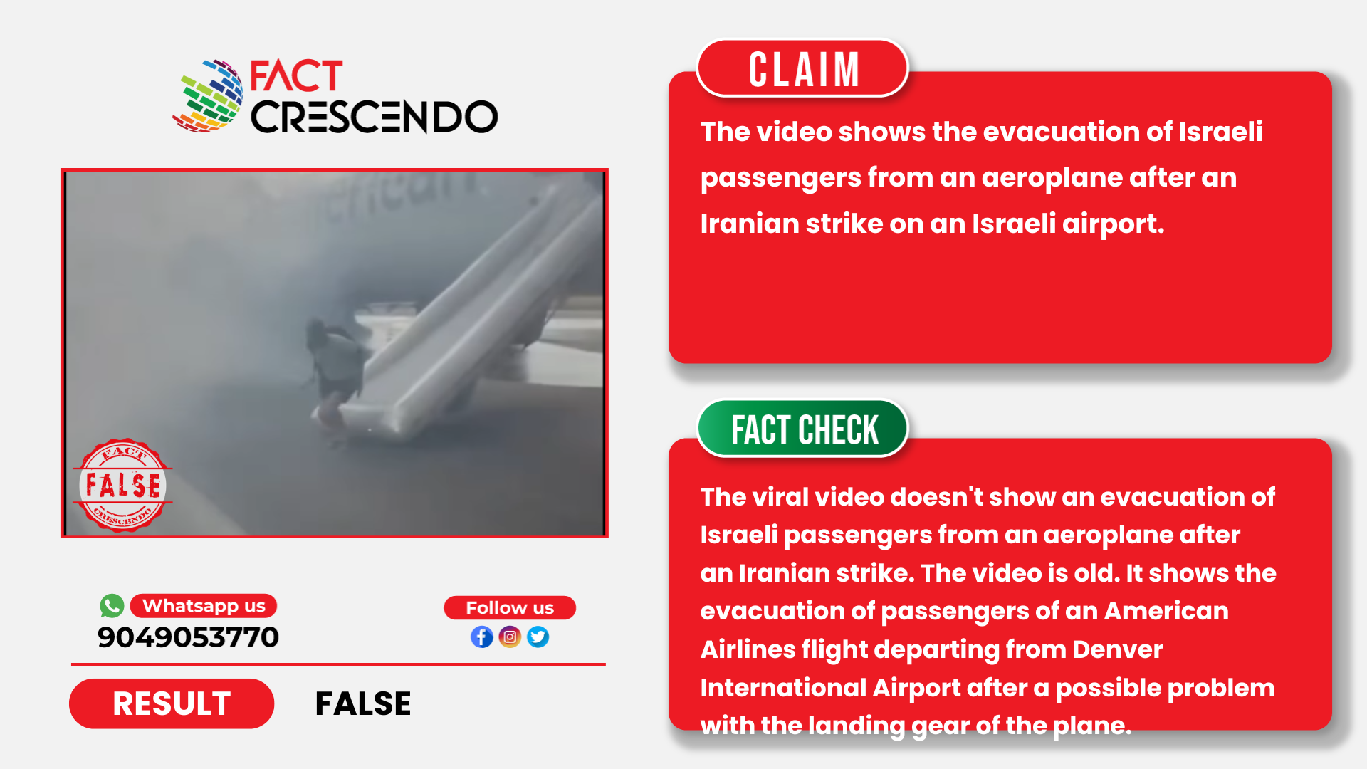 From our investigation, we can say that the claim is false. The viral video doesn’t show an evacuation of Israeli passengers from an aeroplane after an Iranian strike. The video is old. It shows the evacuation of passengers of an American Airlines flight departing from Denver International Airport after a possible problem with the landing gear of the plane.