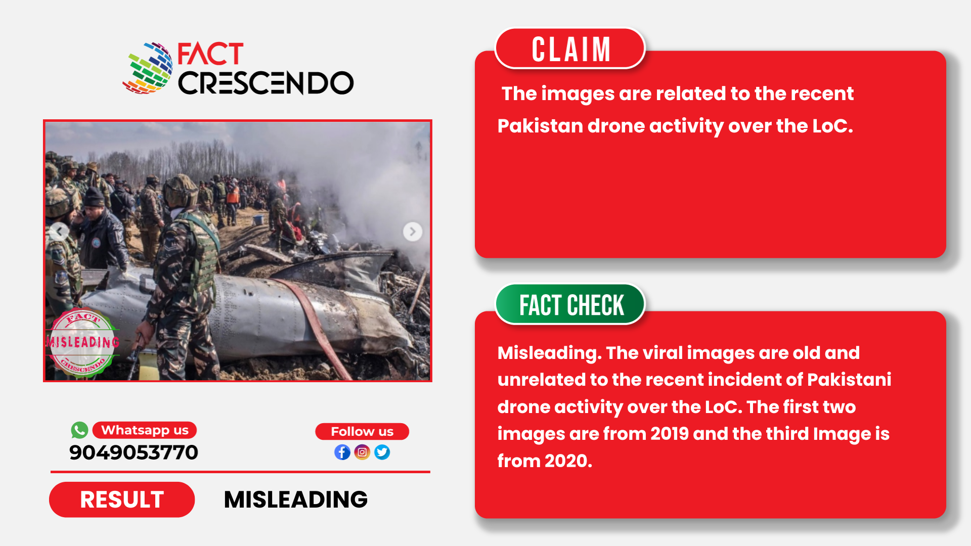 From our investigation, we can say that the claim is misleading. The viral images are old and unrelated to the recent incident of Pakistani drone activity over the LoC. The first two images are from 2019 and the third Image is from 2020.