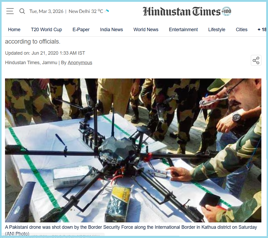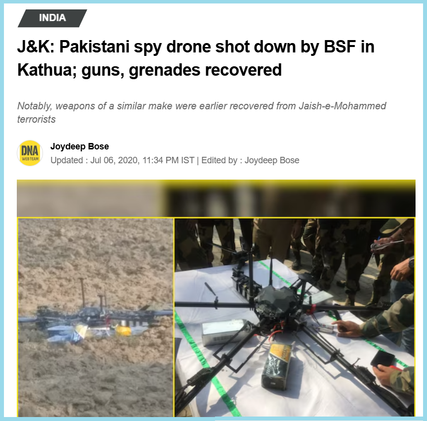 The report read, “One more attempt by Pakistani agencies to drop weapons across the international border using drones has been foiled by the Border Security Force (BSF) at Kathua in Jammu and Kashmir. Upon conducting a thorough search of the payload on the Pakistani drone, arms and ammunition have been recovered. A security official said, “One US-made M4 rifle, two magazines, 60 rounds of ammunition, and seven grenades have been recovered. Primary investigation suggests that this delivery was being made for one ‘Ali Bhai’ as the payload was carrying his name.” The official added, “ The drone is eight-feet wide blade-to-blade and seems to have been controlled by the Pakistani picket opposite the Panesar Post of the BSF on this side of the Kathua sector”…