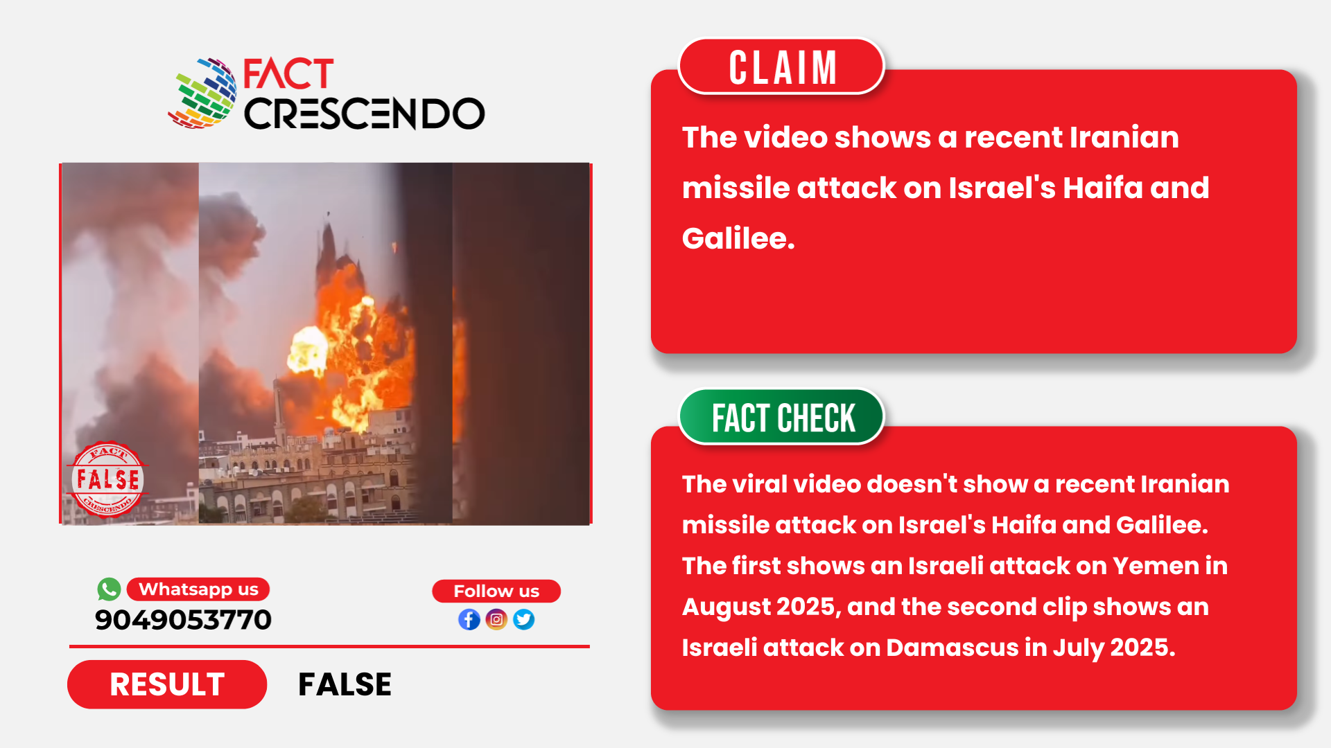 From our investigation, we can say that the claim is false. The viral video doesn’t show a recent Iranian missile attack on Israel’s Haifa and Galilee. The first shows an Israeli attack on Yemen in August 2025 and the second clip shows an Israeli attack on Damascus in July 2025.