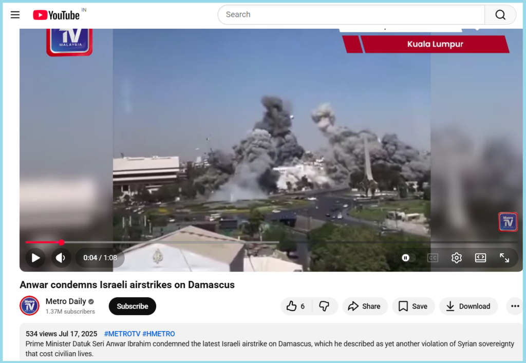 According to the description, the video shows an Israeli attack on Damascus, Syria.