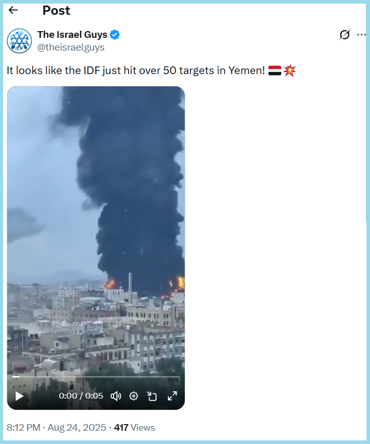 Moving forward, we found a similar clip on an X handle on 24 August 2025. According to the caption, the video shows an Israeli attack on Yemen.
