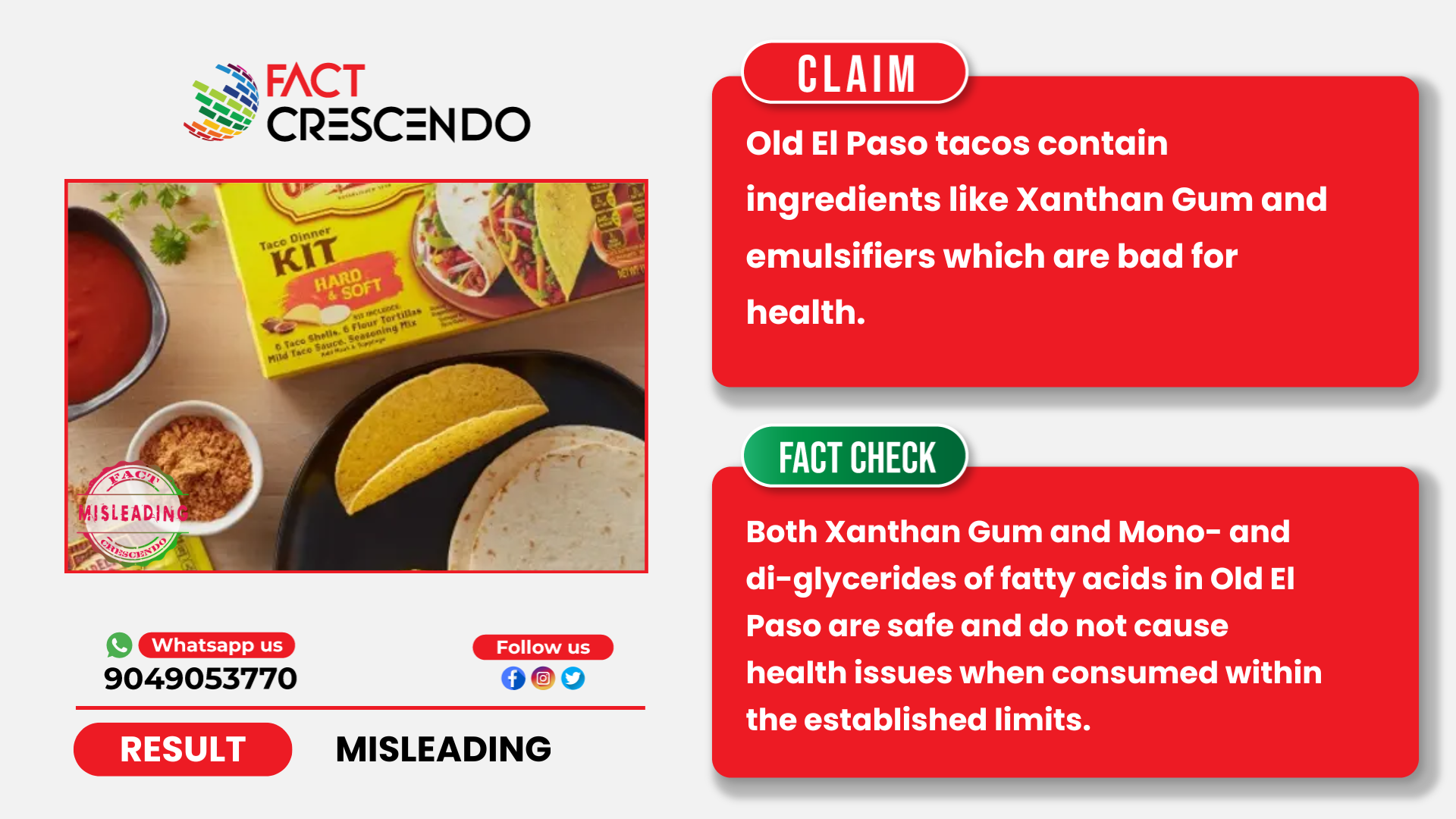 However, Fact Crescendo found the claim to be misleading. Various food safety bodies had concluded that both the ingredients in Old El Paso Tacos are safe when consumed within established limits.