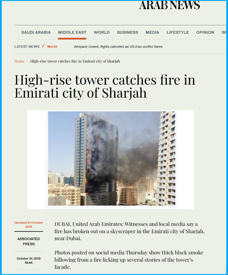 We started our investigation with a keyword and reverse image search on Google and the results led us to a news report by Arab news published in October 2015. As per the report, a fire has broken out on a skyscraper in the Emirati city of Sharjah, near Dubai.