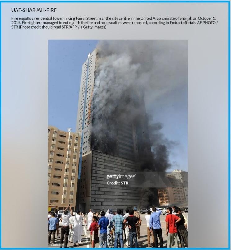 Moving forward we found the same details and image on the stock image website Getty images also. The caption states, “Fire engulfs a residential tower in King Faisal Street near the city centre in the United Arab Emirate of Sharjah on October 1, 2015. Fire fighters managed to extinguish the fire and no casualties were reported, according to Emirati officials”.