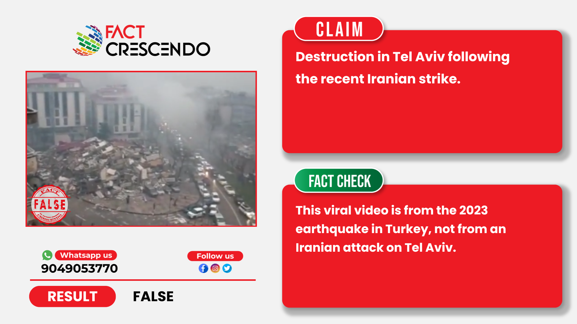 Fact crescendo found that the claim made along with the viral video to be False. This viral video is from the 2023 earthquake in Turkey, not from an Iranian attack on Tel Aviv.