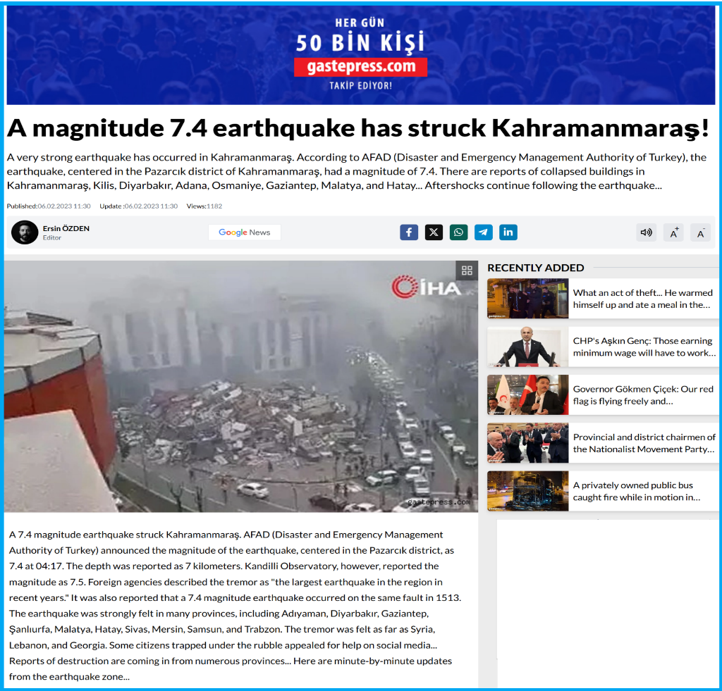 Moving forward we found the same video shared by multiple media outlets with same information. Earthquake with a magnitude of 7.4 occurred in the Pazarcık district of Kahramanmaraş destroying buildings, killing dozens and injured hundreds.