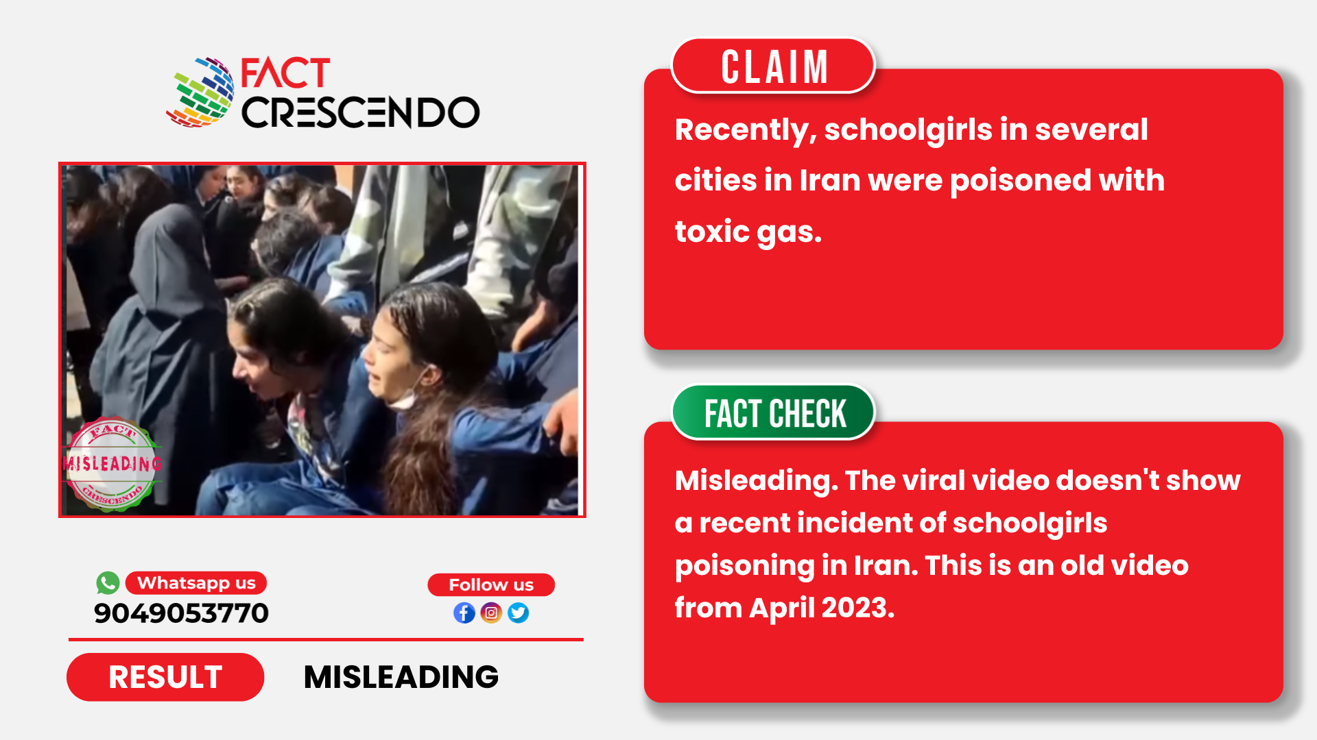 From our investigation, we can say that the claim is misleading. The viral video doesn’t show a recent incident of schoolgirls poisoning in Iran. This is an old video from April 2023.