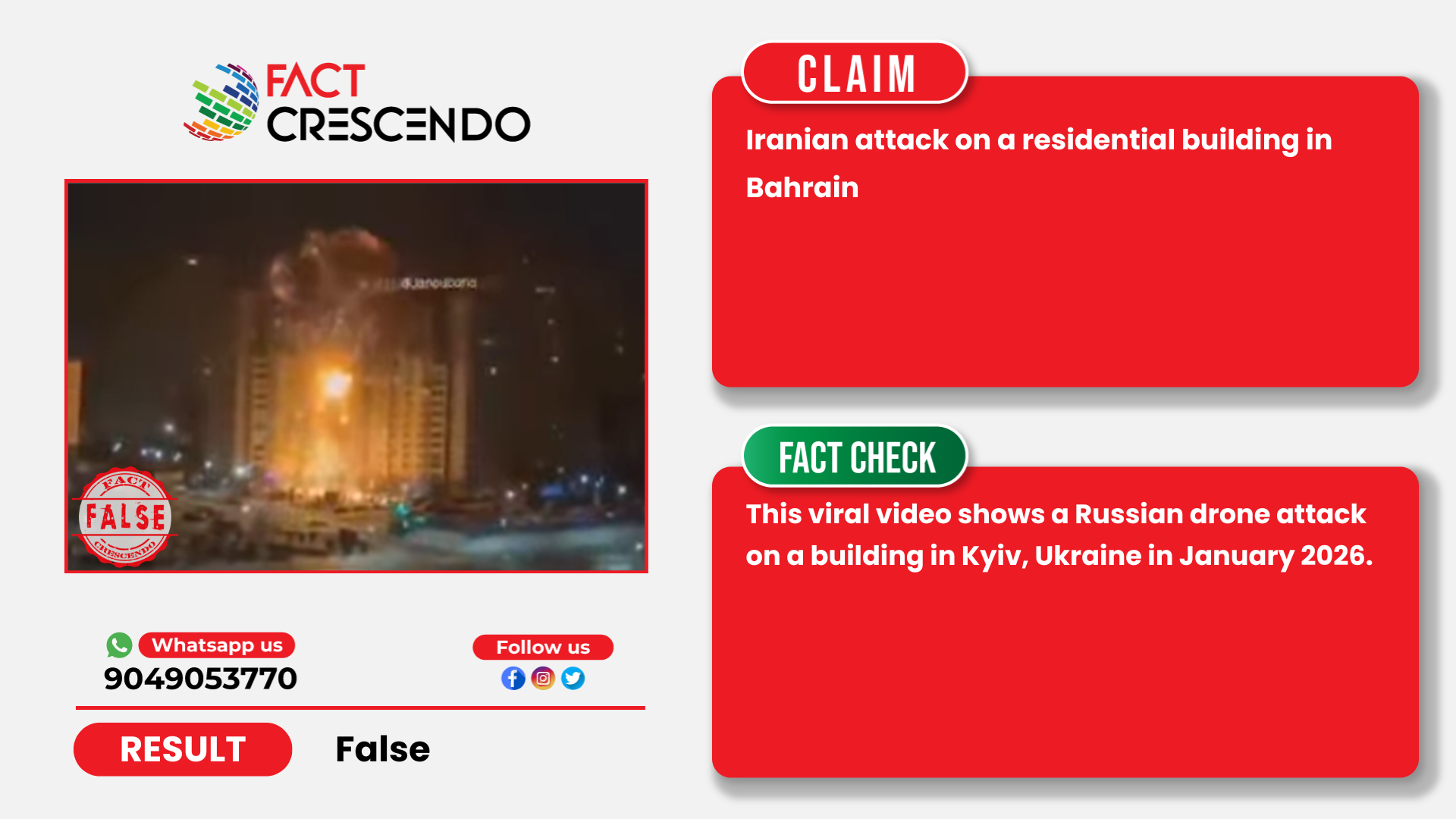Fact crescendo found that the claim made along with the viral video to be False. This viral video shows a Russian drone attack on a building in Kyiv, Ukraine in January 2026.