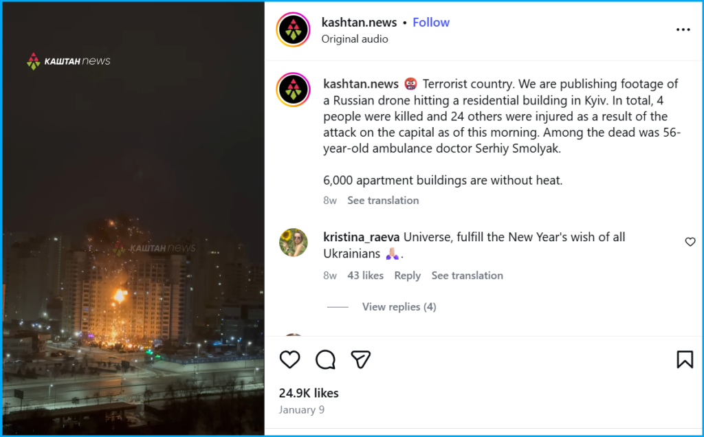 Our investigation began with a reverse image search of key frames from the viral video, which led us to similar video uploaded by Kashtan news on Instagram on 9 January 2026. It is a local independent digital media organisation from Kyiv, Ukraine. The description along with the video states, “We are publishing footage of a Russian drone hitting a residential building in Kyiv. In total, 4 people were killed and 24 others were injured as a result of the attack on the capital”.