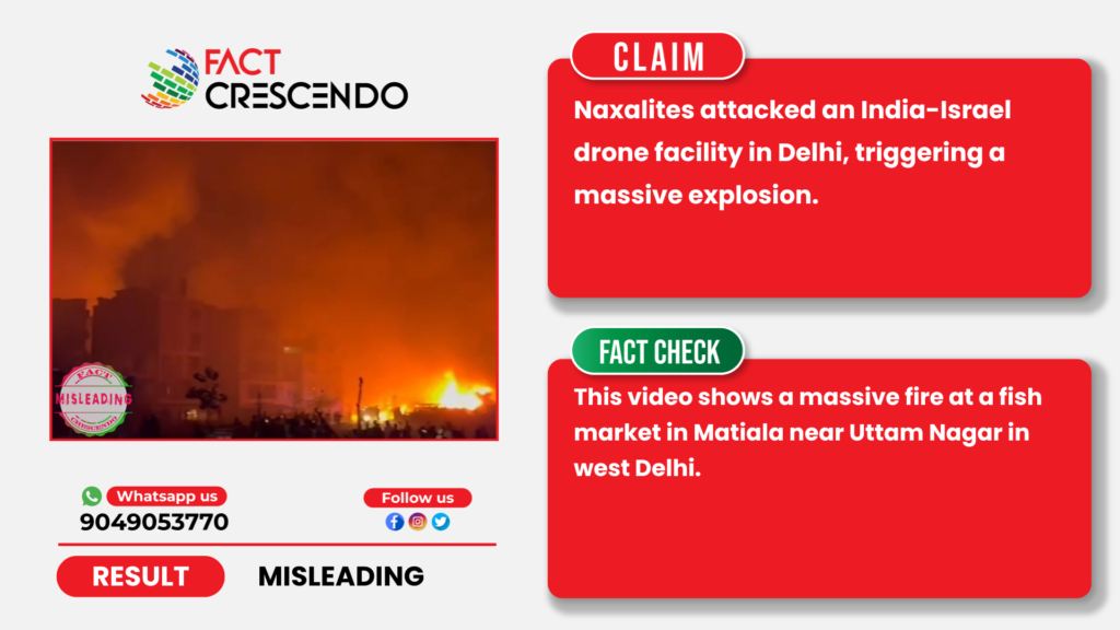 A video of a massive fire and thick smoke in the night sky while firefighting operations are underway is viral on social media. The users who share the video claim that Naxalites attacked an India–Israel drone facility in Delhi, triggering a massive explosion & fire that has engulfed the entire complex.