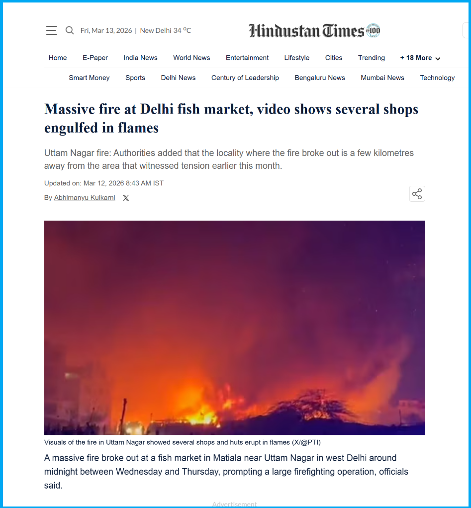 Upon further search, we found several news reports regarding this incident. According to the Hindustan Times report, “A massive fire broke out at a fish market in Matiala near Uttam Nagar in west Delhi around midnight between Wednesday and Thursday, prompting a large firefighting operation”.