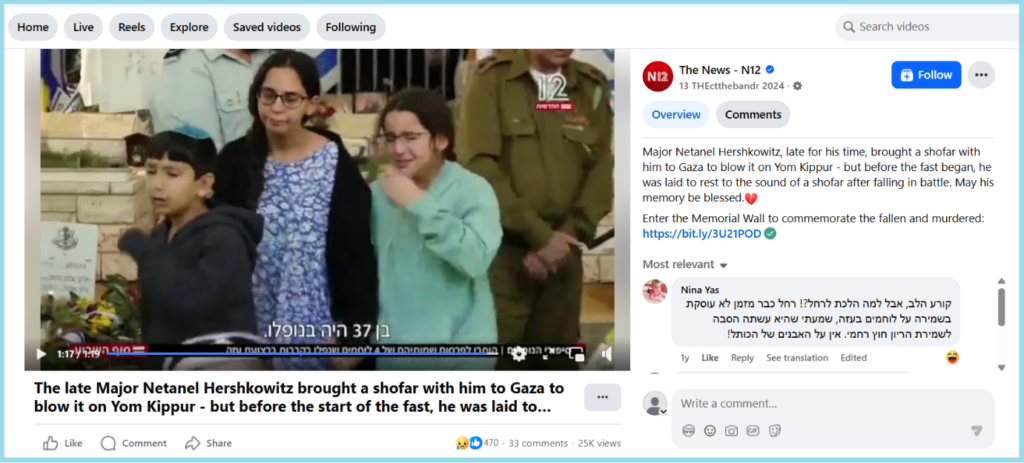 Taking this clue, we conducted a relevant keyword search in Hebrew. This led us to a verified Facebook page where a video report was uploaded about Major Nathaniel Hershkowitz who was killed in the Gaza Strip. In this video, we could spot the girl shown in the viral video.