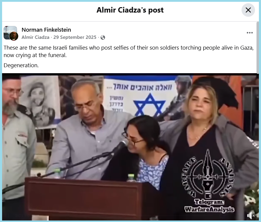 We started our investigation by taking screenshots from the viral video and conducting a reverse image search. This led us to a Facebook post where the viral video was uploaded on September 29, 2025. The caption of the video read, “These are the same Israeli families who post selfies of their son soldiers torching people alive in Gaza, now crying at the funeral.