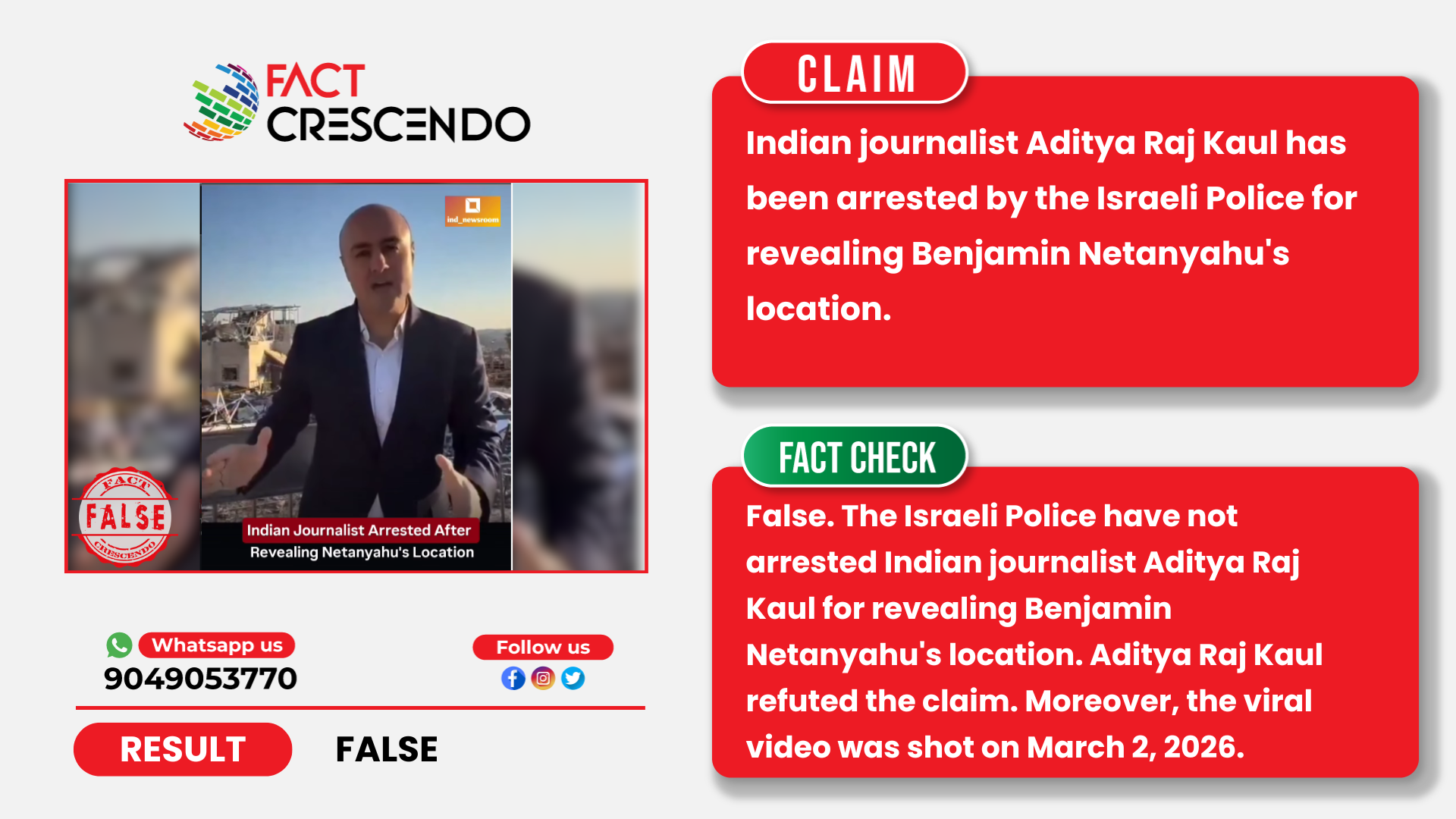 From our investigation, we can say that the claim is false. The Israeli Police have not arrested Indian journalist Aditya Raj Kaul for revealing Benjamin Netanyahu’s location. Aditya Raj Kaul refuted the claim. Moreover, the viral video was shot on March 2, 2026.