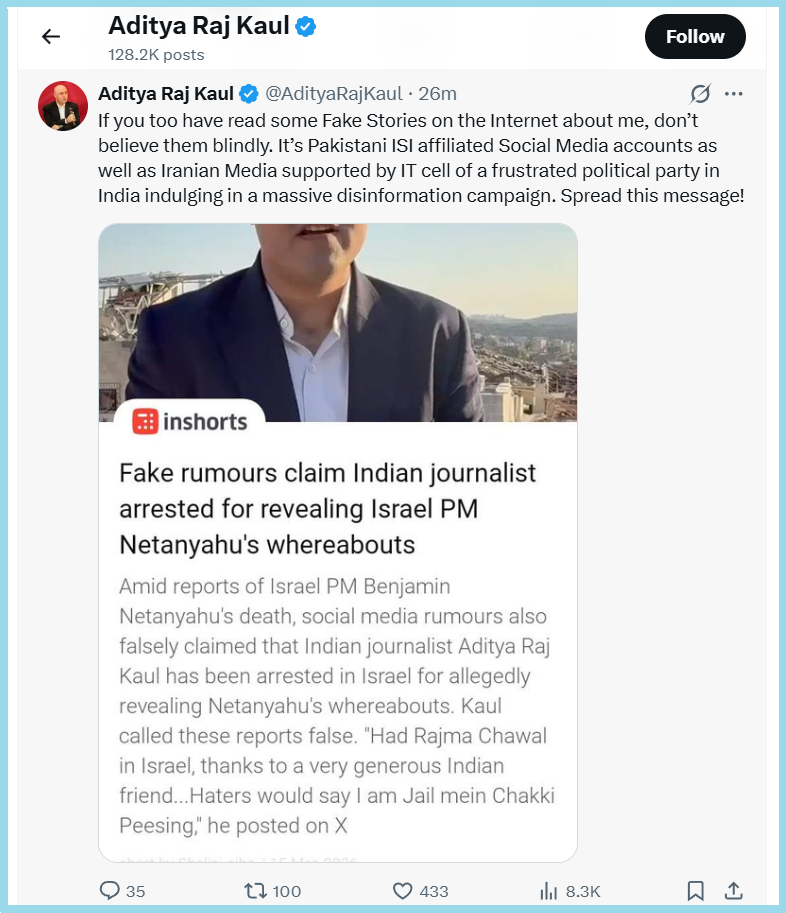 We started our investigation by conducting a relevant keyword search. This led us to the X handle of Aditya Raj Kaul. We could see that he was very active on X. Sharing a screenshot of a report, which mentioned the viral claim was a fake one, he tweeted on March 16, 2026, at 12:09 PM, “If you too have read some Fake Stories on the Internet about me, don’t believe them blindly. It’s Pakistani ISI affiliated Social Media accounts as well as Iranian Media supported by IT cell of a frustrated political party in India indulging in a massive disinformation campaign. Spread this message!”