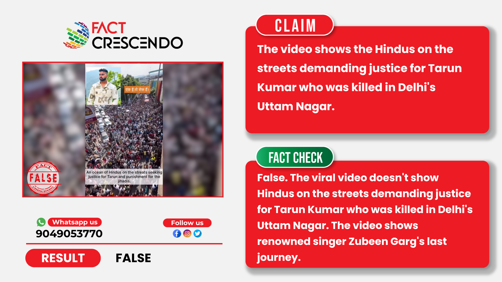 From our investigation, we can say that the claim is false. The viral video doesn’t show Hindus on the streets demanding justice for Tarun Kumar who was killed in Delhi’s Uttam Nagar. The video shows renowned singer Zubeen Garg’s last journey.
