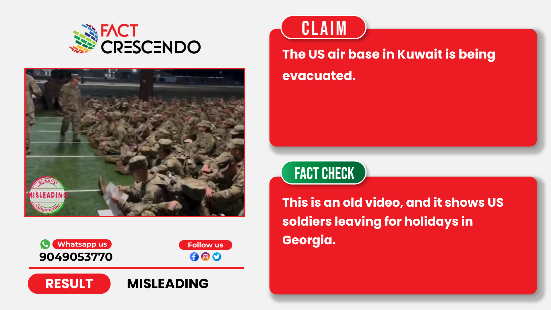 Fact crescendo found that the claim made along with the viral video to be Misleading. The video shows US soldiers leaving for holidays in Georgia in 2024. It is not related to the current Iran-Israel war.