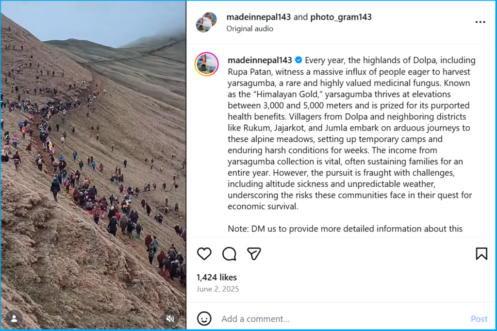We started our investigation by running a reverse image search on Google, and the results led us to a similar video uploaded on an Instagram account on 2 June, 2025, by an account called MadeInNepal. The description of the post states that, every year, Dolpa’s highlands, particularly Rupa Patan, attract many individuals seeking to harvest yarsagumba, a highly valued medicinal fungus known as “Himalayan Gold.” This fungus grows at elevations of 3,000 to 5,000 meters and is sought for its health benefits. Villagers from Dolpa and nearby districts undertake challenging journeys to collect yarsagumba, setting up temporary camps and enduring harsh conditions for weeks. The income from this collection is crucial for families, often sustaining them for a year, but they also face risks such as altitude sickness and unpredictable weather during the process.