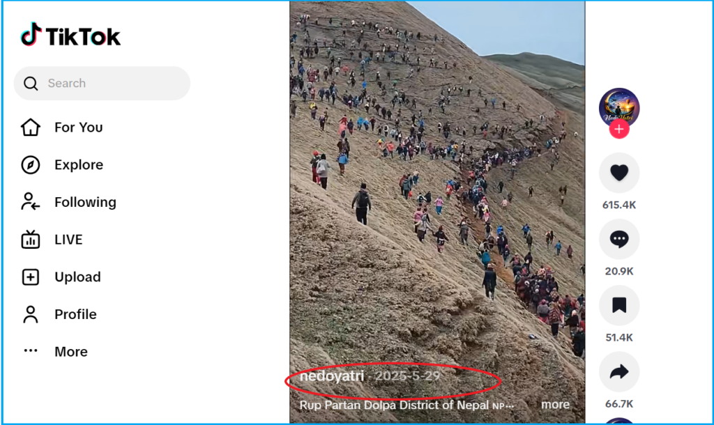 This Instagram account MadeInNepal, credited an account called Nedo Soch for this video, and we conducted further searches and found the same viral video on the TikTok account of Nedo Yatri, and it was uploaded on 29 May 2025. According to the post, this footage was from the Rup-Patan region in Nepal’s Dolpa district.