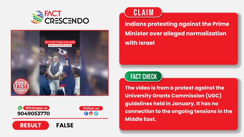 A video of a violent mob of protesters burning an effigy of Prime Minister Narendra Modi is going viral on social media with the claim that Indians are protesting against PM Modi due to his alleged normalization of relations with Israel.