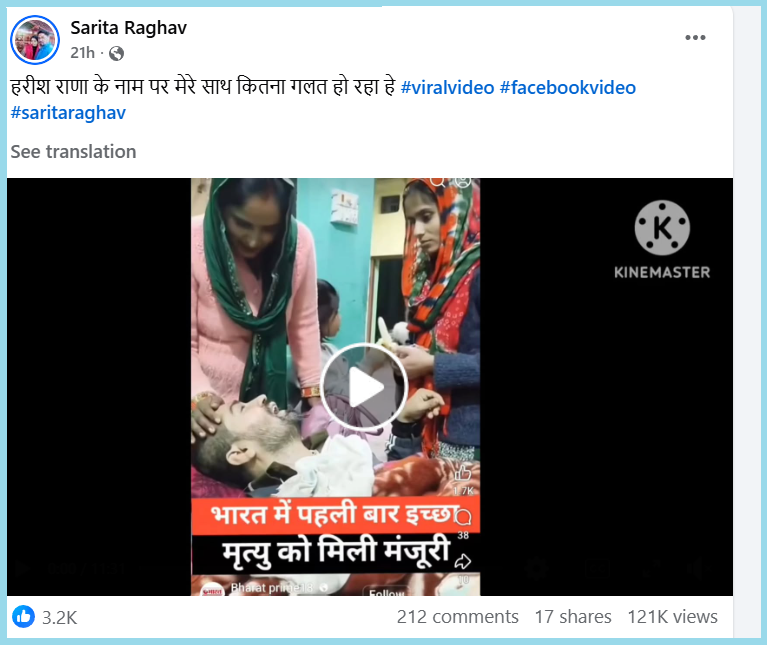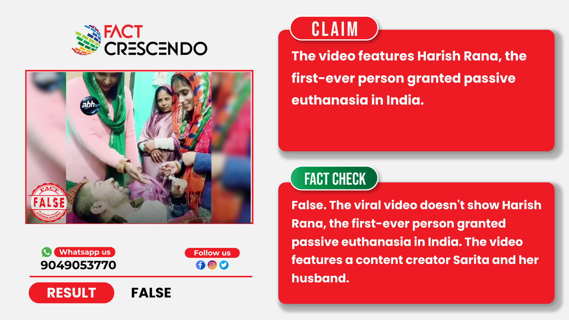 From our investigation, we can say that the claim is false. The viral video doesn’t show Harish Rana, the first-ever person granted passive euthanasia in India. The video features a content creator Sarita and her husband.