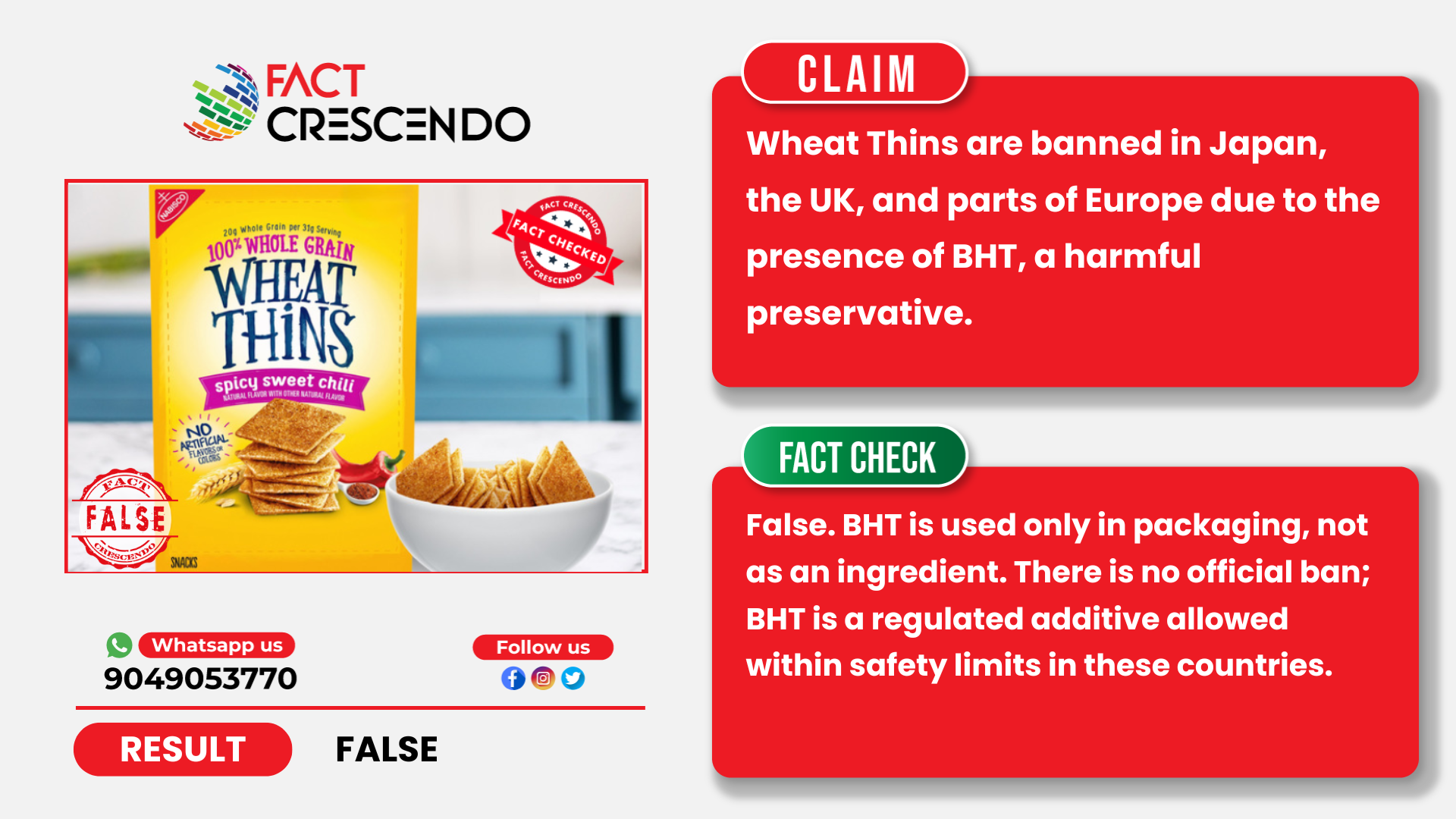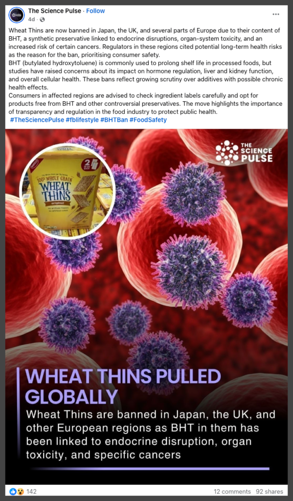 A claim circulating widely on social media platforms such as Facebook, Instagram, and LinkedIn alleges that Wheat Thins have been banned in Japan, the United Kingdom, and parts of Europe due to the presence of butylated hydroxytoluene (BHT), a synthetic preservative linked to serious health risks. The claim often frames BHT as a harmful chemical associated with endocrine disruption, organ toxicity, and cancer. However, a review of regulatory frameworks, product composition, and scientific evidence shows that this claim is misleading.