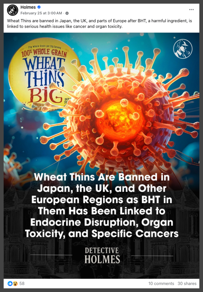 The claim appears in multiple viral posts, including those shared by multiple pages stating that “Wheat Thins are now banned in Japan, the UK, and several parts of Europe due to their content of BHT.” These posts often imply that the crackers themselves contain BHT and that health concerns have led to outright bans.