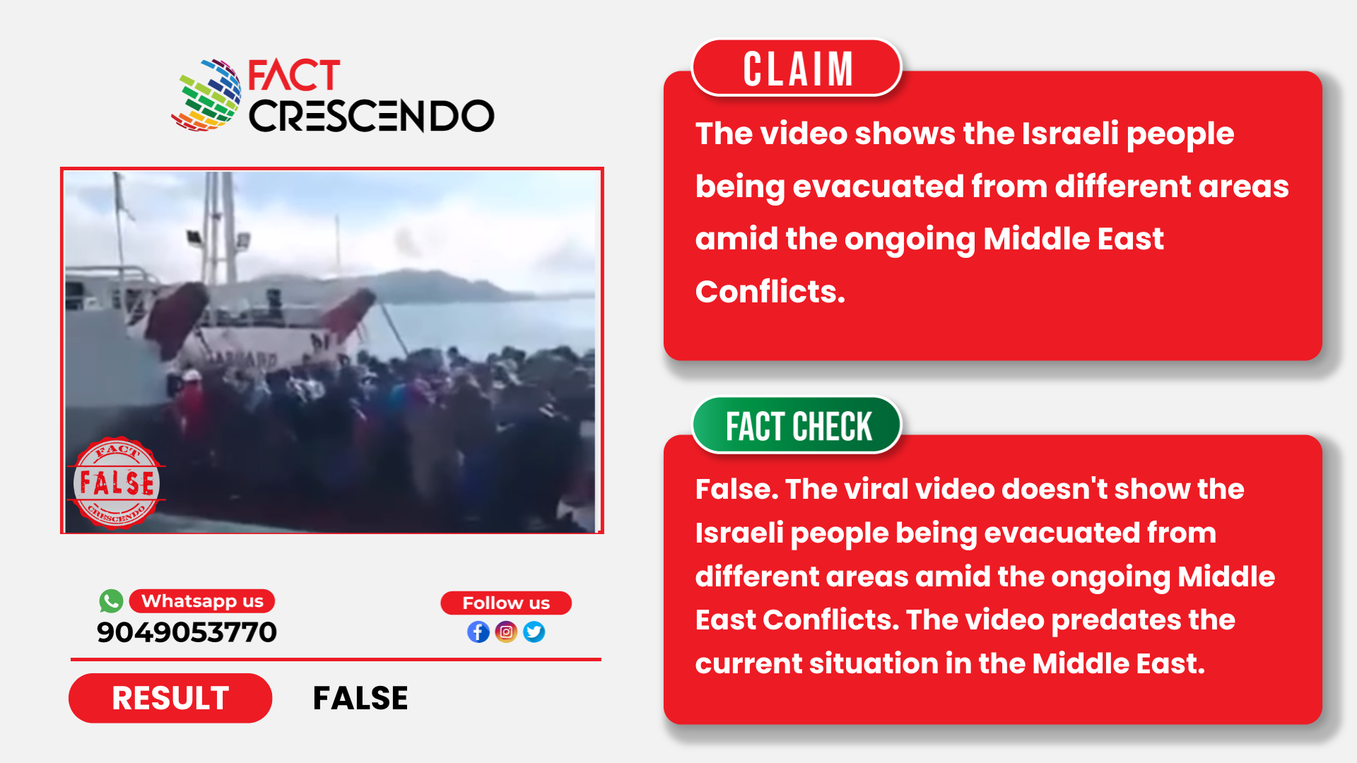 From our investigation, we can say that the claim is false. The viral video doesn’t show the Israeli people being evacuated from different areas amid the ongoing Middle East Conflicts. The video predates the current situation in the Middle East.