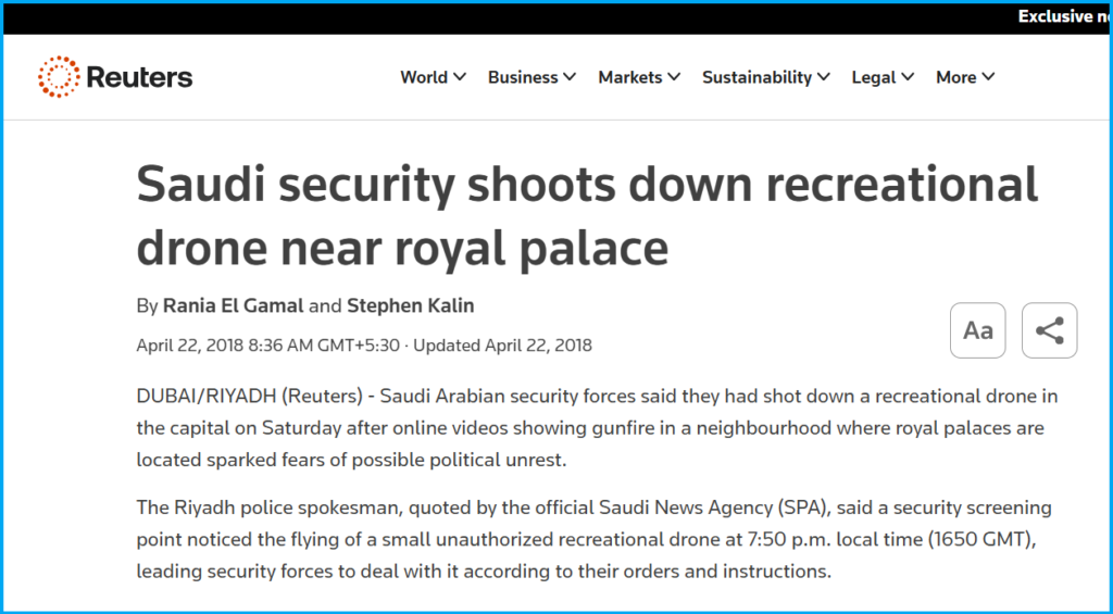 According to an Al Jazeera report, “Saudi forces have shot down a toy drone near the royal palace in the capital, Riyadh, as videos posted online purported to show the area ringing with heavy gunfire.