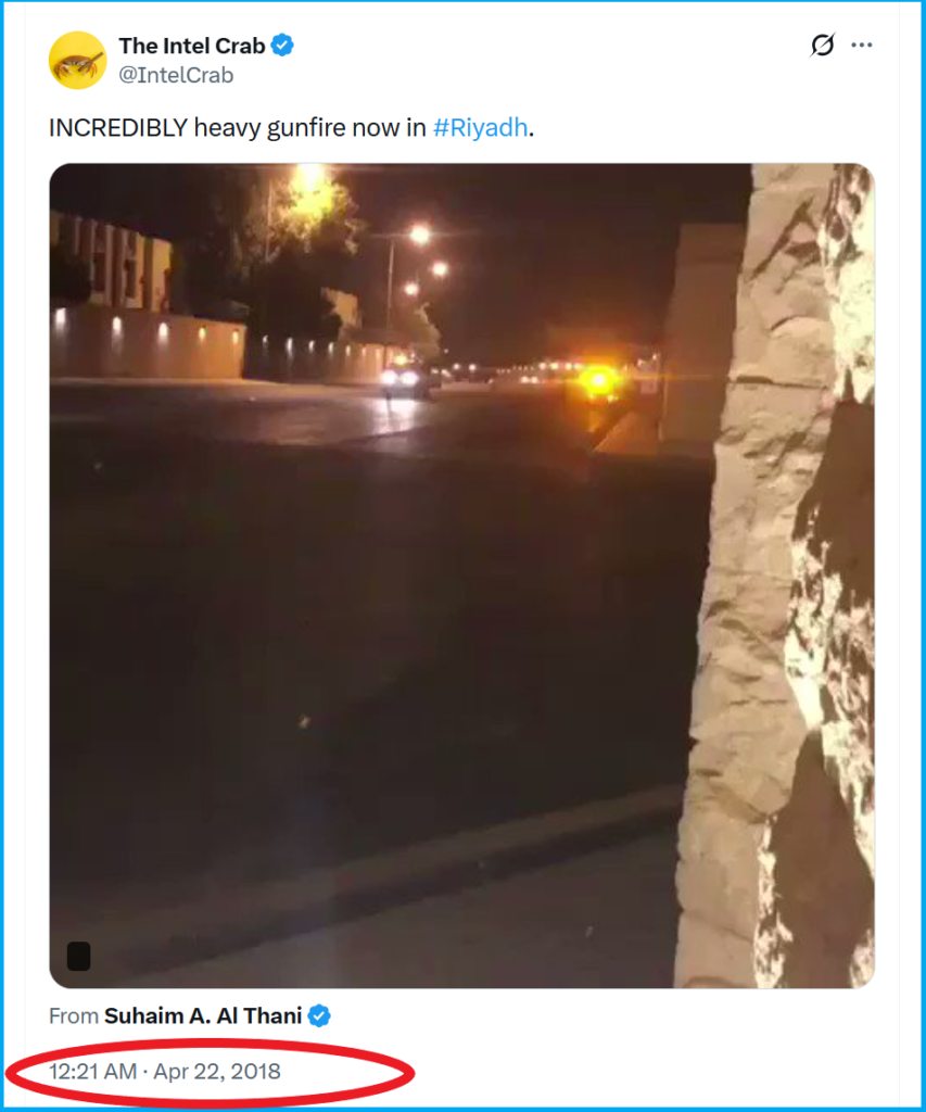 We began our investigation with a reverse image search on Google, and the results led us to a similar video uploaded on X in April 2018, sharing the same clip with captions such as “INCREDIBLY heavy gunfire now in #Riyadh.”