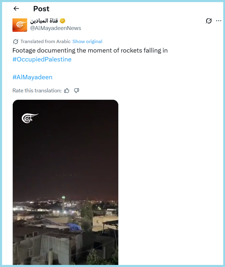 The translation of the tweet read, “Footage documenting the moment of rockets falling in #OccupiedPalestine”