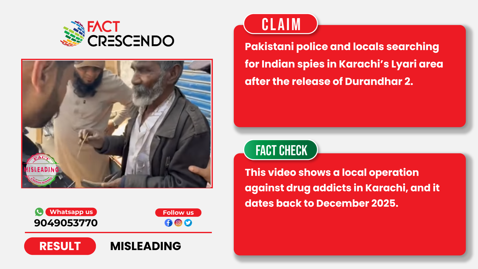 A video of police officials examining a man lying by the roadside is going viral on social media with claims that it depicts authorities and residents in Pakistan searching for Indian spies in Karachi’s Lyari area following the release of the Bollywood movie Dhurandhar 2 (Dhurandhar: The Revenge)