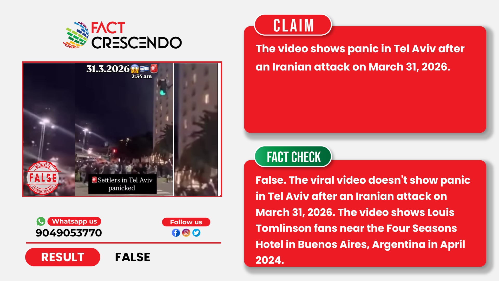 From our investigation, we can say that the claim is false. The viral video doesn’t show panic in Tel Aviv after an Iranian attack on March 31, 2026. The video shows Louis Tomlinson fans near the Four Seasons Hotel in Buenos Aires, Argentina in April 2024.