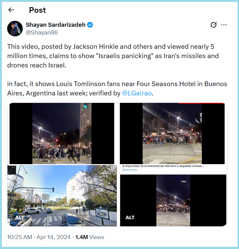 The tweet read, “This video, posted by Jackson Hinkle and others and viewed nearly 5 million times, claims to show “Israelis panicking” as Iran’s missiles and drones reach Israel.