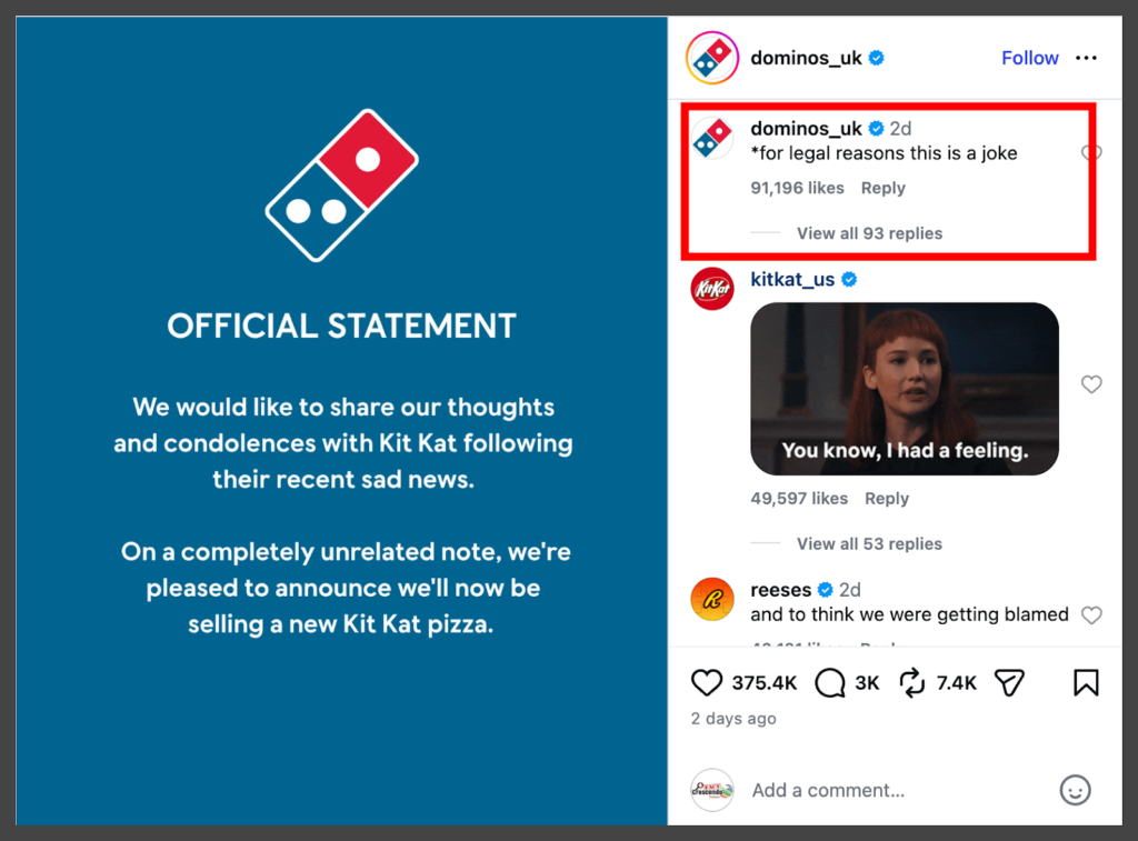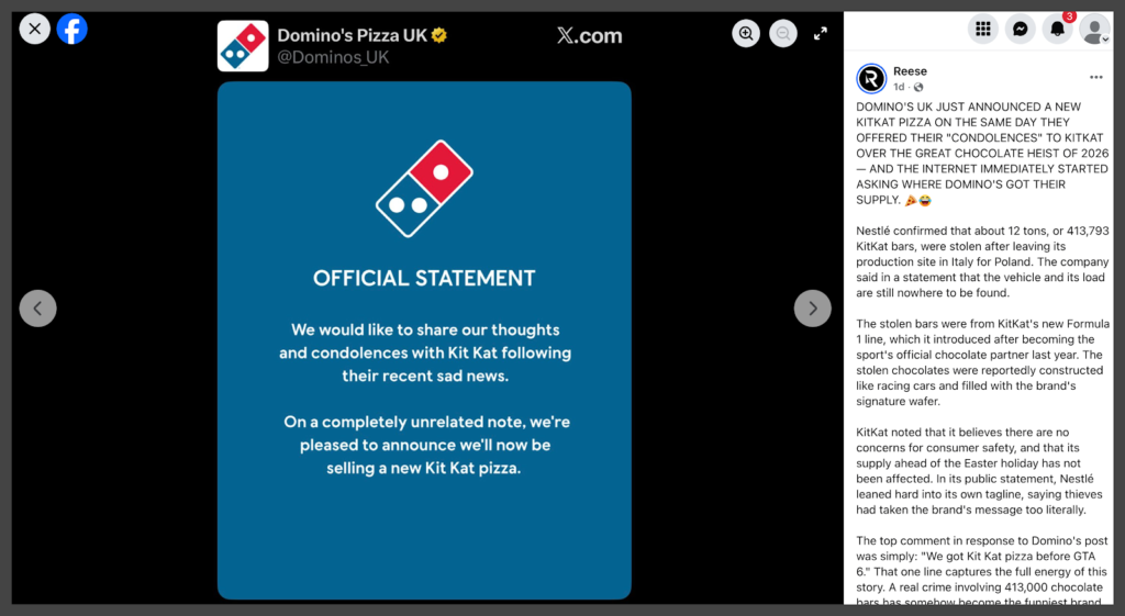 Domino’s UK did publish a post with the above statement on March 30, 2026, via its official Facebook, Instagram, and X accounts. However, Domino’s added a note in the caption clarifying “*for legal reasons this is a joke”, indicating it has no plans for a Kit Kat-flavored pizza and that the announcement was part of a social media trend, not a commercial product rollout.