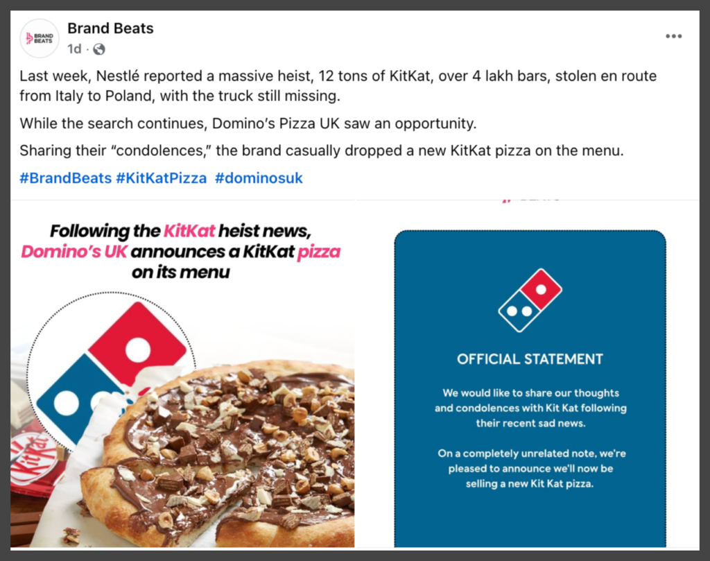 Multiple users and pages claimed that Domino’s is releasing a Kit Kat pizza, citing the brand’s official statement about the Kit Kat theft incident.