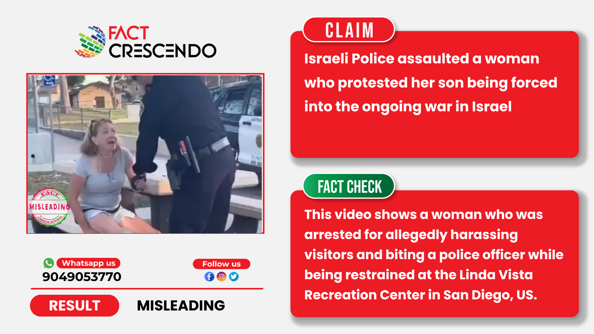 Fact Crescendo found the claim made along with the viral video to be Misleading. This video shows a woman who was arrested for allegedly harassing visitors and biting a police officer while being restrained at the Linda Vista Recreation Center in San Diego, US.