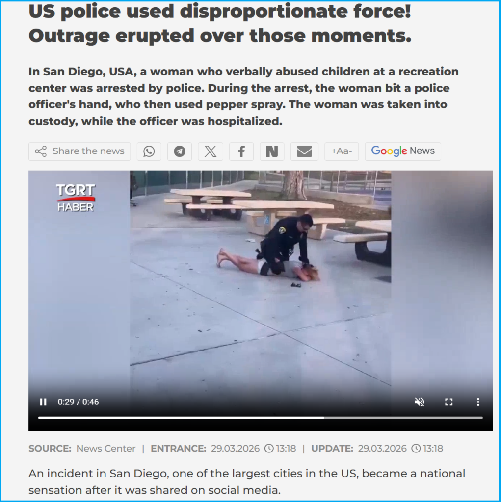 We started our investigation with a reverse image search on Google, and the results led us to a similar video uploaded on a Turkish media website on 29 March 2026. The report states, “In San Diego, USA, a woman who verbally abused children at a recreation center was arrested by police. During the arrest, the woman bit a police officer’s hand, who then used pepper spray. The woman was taken into custody, while the officer was hospitalized”.