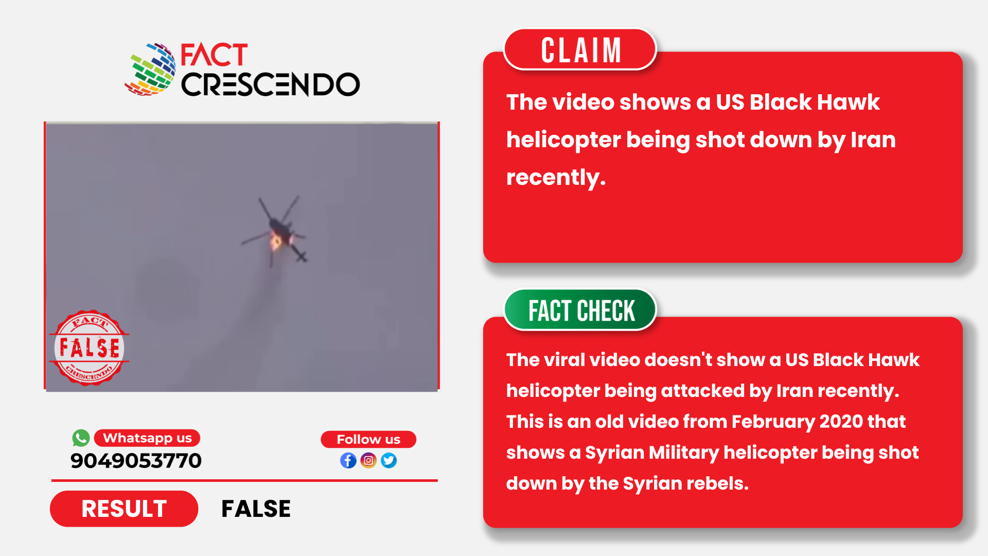 From our investigation, we can say that the claim is false. The viral video doesn’t show a US Black Hawk helicopter being attacked by Iran recently. This is an old video from February 2020 that shows a Syrian Military helicopter being shot down by the Syrian rebels.