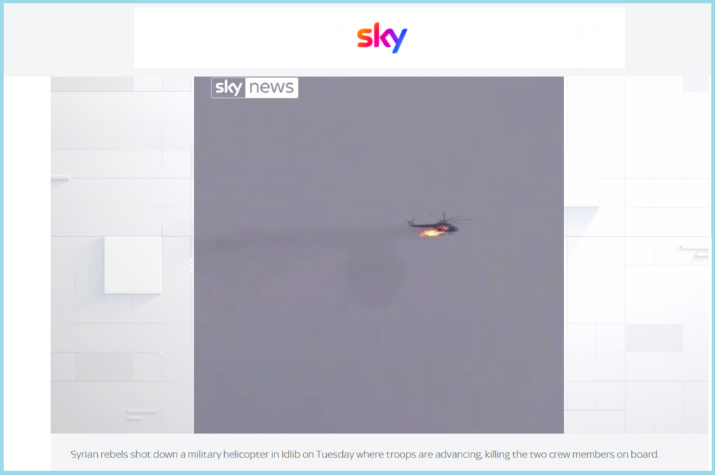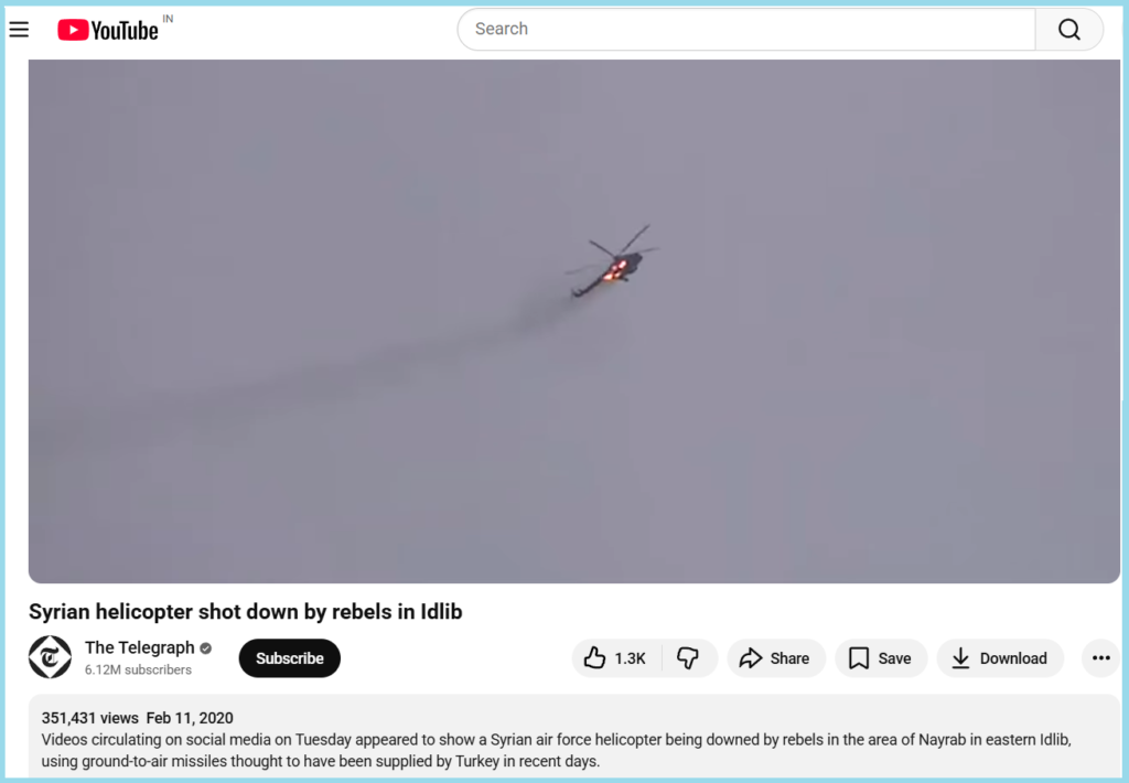 The description of the video read, “Videos circulating on social media on Tuesday appeared to show a Syrian air force helicopter being downed by rebels in the area of Nayrab in eastern Idlib, using ground-to-air missiles thought to have been supplied by Turkey in recent days.