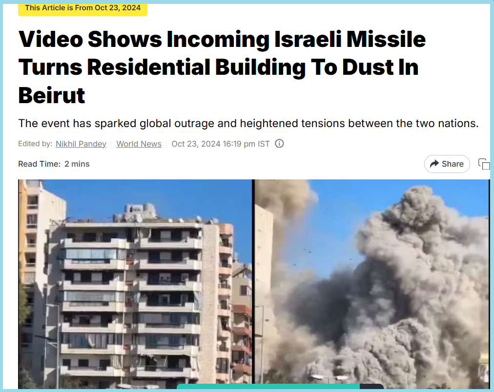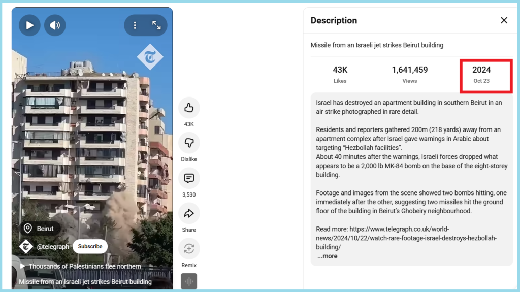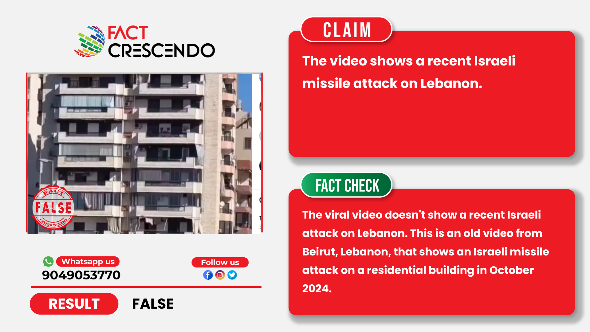 From our investigation, we can say that the claim is misleading. The viral video doesn’t show a recent Israeli attack on Lebanon. This is an old video from Beirut, Lebanon, that shows an Israeli missile attack on a residential building in October 2024.