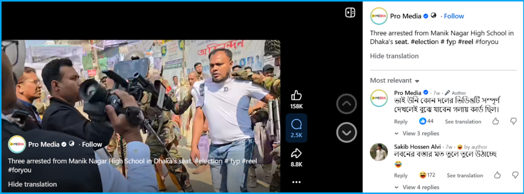 Next, we conducted a reverse image search on Google, and the results led us to a similar video uploaded by a Bangladeshi media Facebook page on 12 February 2026. The post indicates that the incident is from near the Maniknagar Model High School polling station in Dhaka.