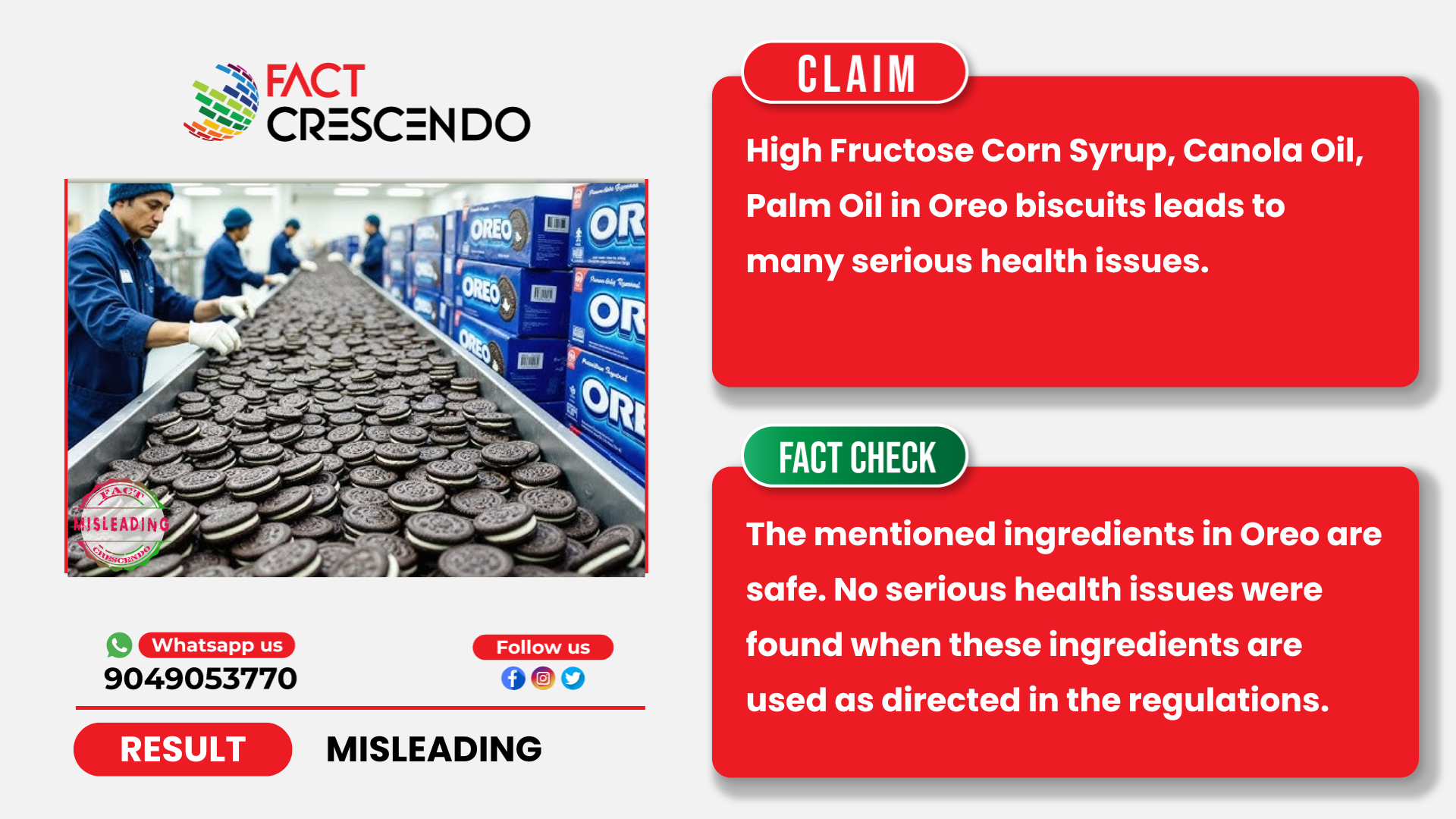 A viral social media post had claimed that ingredients like High Fructose Corn Syrup, Canola Oil and Palm Oil in Oreo biscuits are harmful to health. The claim suggests that these ingredients lead to diabetes, fatty liver and many chronic issues.