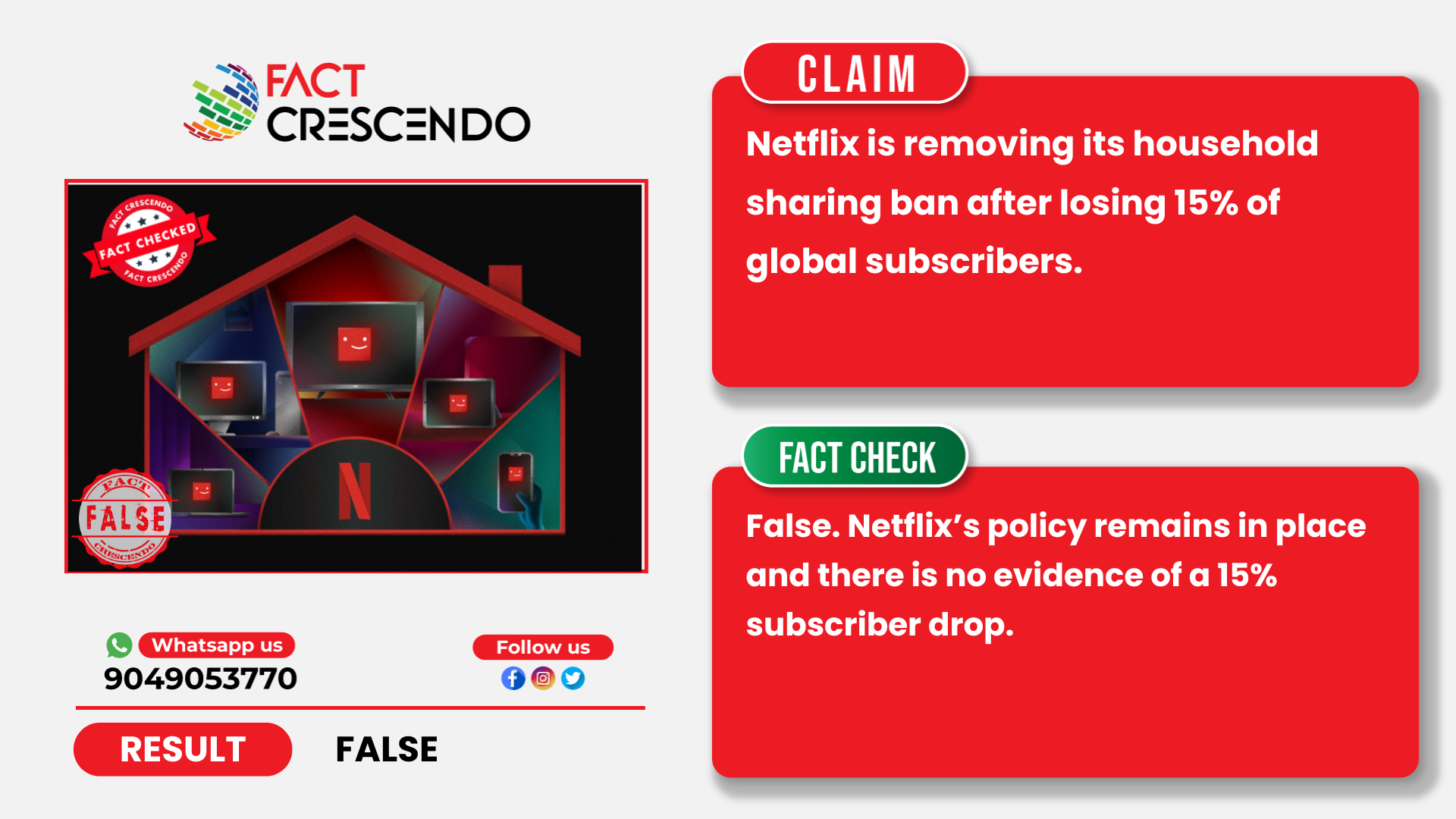 A claim circulating widely on social media platforms alleges that Netflix is reversing its household sharing ban after suffering a 15% drop in global subscribers. The claim has gained traction amid ongoing public debate over Netflix’s password-sharing restrictions introduced in recent years. However, we found this claim to be false.