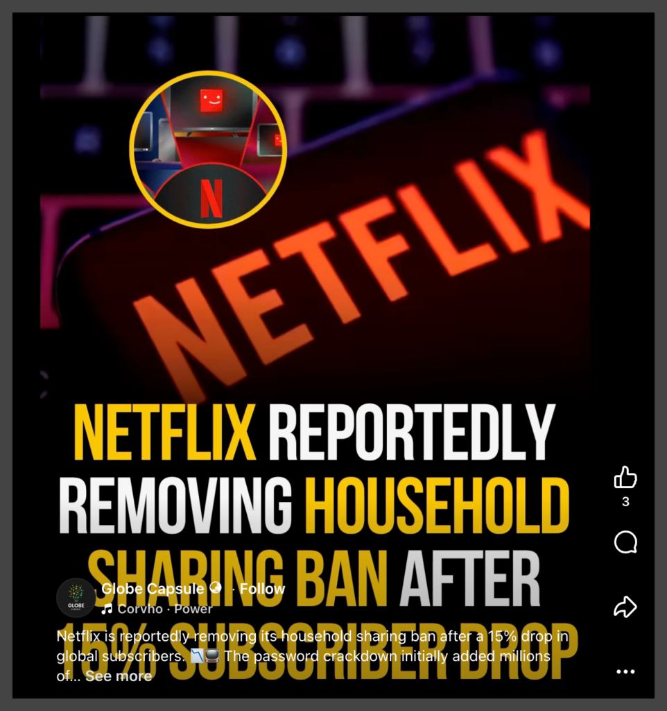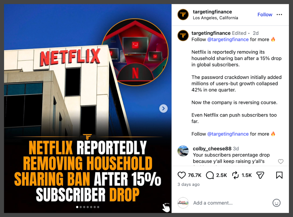 Posts circulating online typically state that Netflix is “removing its household sharing ban” due to a “15% drop in subscribers,” often without citing any sources. Variations of this claim appear across Instagram and Facebook.