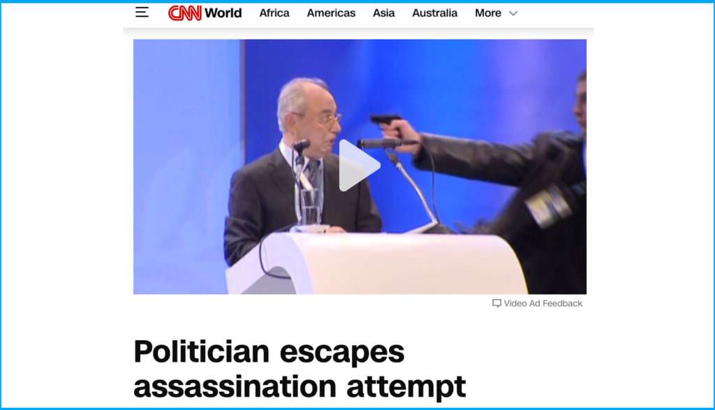 we have also found a report on CNN that provides further context to the incident. The video footage from CNN shows a gunman attempting to shoot the leader of Bulgaria’s ethnic Turkish party, Ahmed Dogan, during a national conference in 2013.