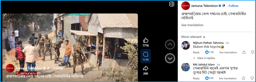 We started our investigation by closely observing the viral video, and we found the logo of Jamuna TV. Using this hint, we traced the video back to Jamuna TV’s official Facebook page, where it was Uploaded on 12 February 2026 According to the caption, the footage was from Bangladesh and showed the army resorting to a baton charge after individuals attempted to seize a polling centre in Brahmanbaria during the general elections in February 2026.